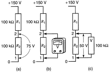Pour illustrer, considérons le circuit composé de deux résistances de 100 kΩ groupées en série et alimentées par une source de 150 V (Fig. 6-8a).
