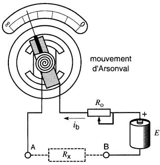 Il est constitué essentiellement d'un milliampèremètre dont l'échelle est calibrée de zéro ohm à l'infini (∞), d'une pile sèche de tension E et d'une résistance variable Ro.
