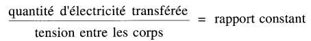 De plus, la charge positive de l'un des corps est exactement égale à la charge négative de l'autre. Les expériences ont démontré que lorsque les corps demeurent fixes l'un par rapport à l'autre, la tension est proportionnelle à la quantité d'électricité transférée.
