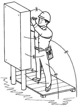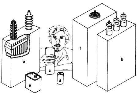De la même façon, une personne se tenant debout sur une plateforme isolée produit avec la terre un condensateur dont la capacitance est de l'ordre de 200 picofarads (Fig. 21-3).