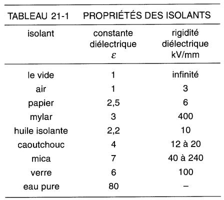 Le tableau 21-1 donne les valeurs approximatives de la constante diélectrique e de quelques isolants usuels, ainsi que leur rigidité diélectrique.