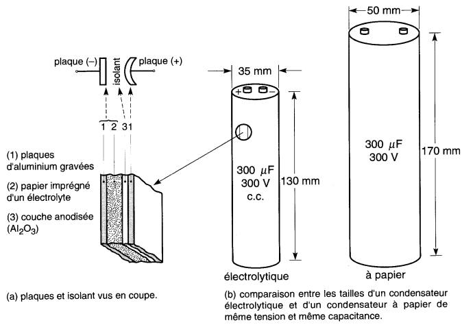 Donc, pour une capacitance donnée, la surface des plaques d'un condensateur à tension élevée doit être plus grande que celle d'un condensateur à basse tension. Il s'ensuit qu'un condensateur de 40 µF, 600 V doit nécessairement être plus gros qu'un autre de 40 µF, 50 V.