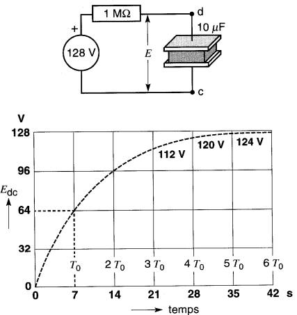 Lorsqu'une tension continue est appliquée à un condensateur C en série avec une résistance R, le condensateur se charge et la tension entre ses bornes augmente en fonction du temps selon une courbe exponentielle.