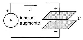 Plus généralement, lorsque la tension aux bornes d'un condensateur varie de façon quelconque, le courant circulant dans le condensateur dépend du taux de changement ΔE/Δt de la tension. Le courant I est donné par la loi fondamentale I = C ΔE/Δt.