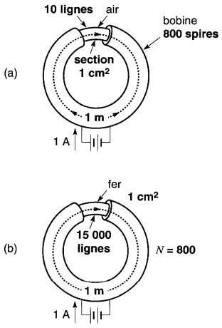 Cependant, si l'on pouvait mesurer au moyen d'un «fluxmètre» le nombre de lignes traversant chacun des noyaux, on constaterait que le nombre de lignes dans le fer doux dépasse des centaines de fois celui dans l'air.