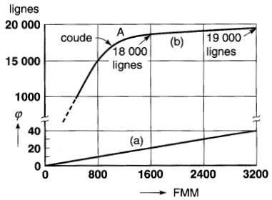 Passé ce point, le nombre de lignes croît assez peu, même pour une grande augmentation de la force magnétomotrice. Ainsi, dans l'exemple ci.dessus, pour une FMM de 800 A, le flux est de 15 000 lignes; pour une FMM de 1600 A, il est de 18 000 lignes seulement.