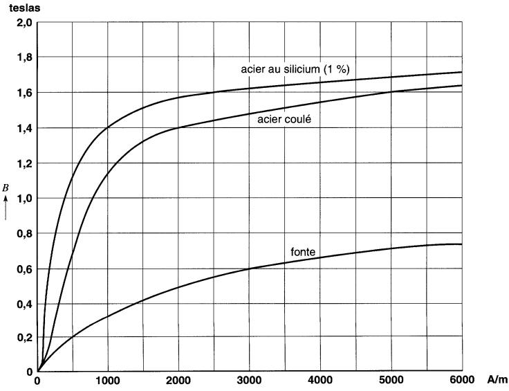 Si l'on trace un nouveau graphique donnant la relation entre la FMM et le flux, on n'obtient plus une droite mais une courbe (b) qu'on appelle courbe de saturation (Fig. 14-7).