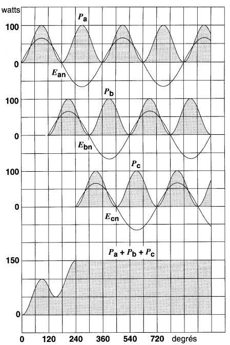 De la même façon, dans un système électrique triphasé, les trois phases sont identiques, mais elles fournissent leur puissance à des moments différents. Par conséquent, le flux total de puissance est très uniforme.