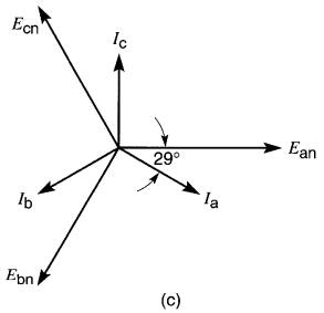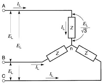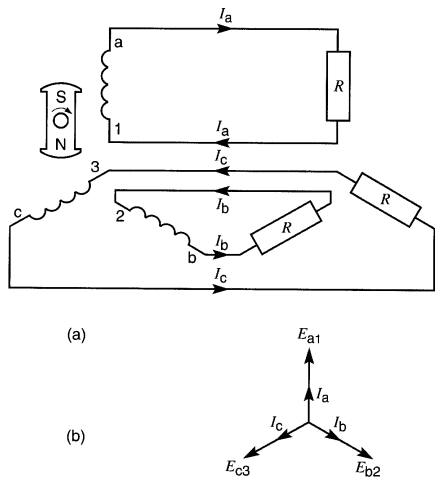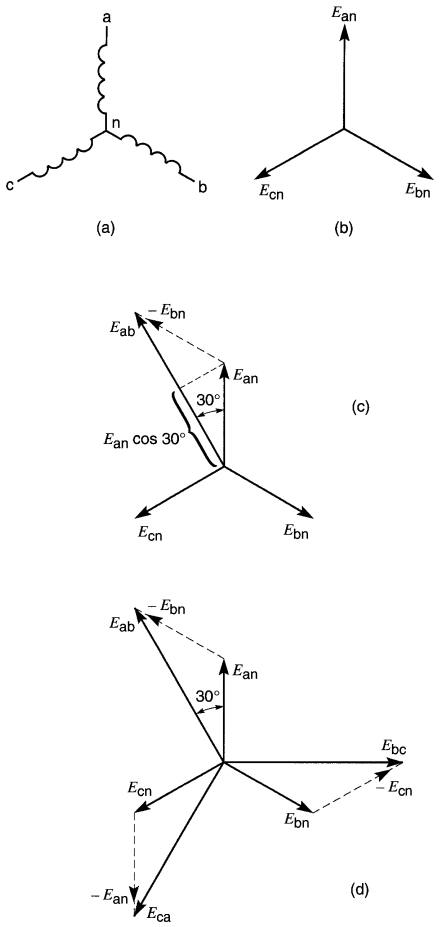 Les bornes 1, 2, 3 sont raccordées ensemble pour former une seule borne n, appelée neutre. Le diagramme vectoriel des trois tensions induites Ean, Ebn, Ecn est montré à la Fig. 26-7b.