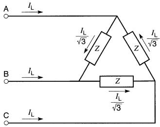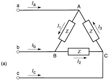26-5 Trois charges résistives Z sont raccordées en triangle selon le schéma de la Fig. 26-10a. La tension entre les lignes A - B - C est de 13,2 kV et le courant dans les fils de ligne est de 1202 A.