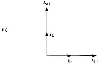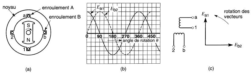 Leurs bornes sont respectivement identifiées par les symboles a,1 et b,2. Quand on fait tourner le rotor, des tensions Ea1 et Eb2 sont induites dans chacun des enroulements. Ces tensions ont évidemment même valeur et même fréquence; cependant, elles n'atteignent pas leur valeur maximale en même temps.