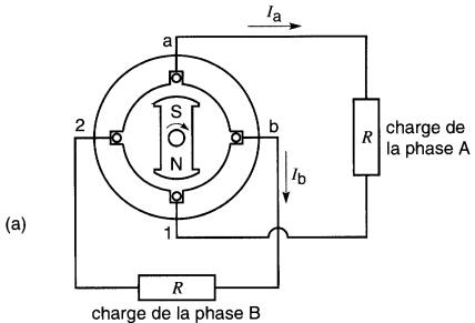 Sur la Fig. 26-2a, elles alimentent chacune un circuit distinct; le circuit raccordé aux bornes a,1 et celui raccordé aux bornes b,2 sont identifiés comme étant respectivement la phase A et la phase B. L'ensemble constitue un système à deux phases et l'alternateur est dit diphasé.