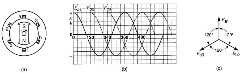 Les trois tensions Ea1, Eb2 et Ec3, déphasées l'une de l'autre de 120°, sont représentées sous forme de courbes sinusoïdales à la Fig. 26-3b, et vectoriellement à la Fig. 26-3c.