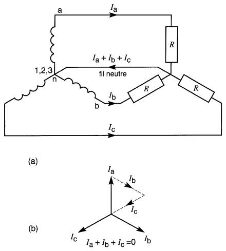Si, de plus, les trois résistances sont égales, les courants ont la même valeur efficace, mais ils sont déphasés de 120° l'un de l'autre (Fig. 26-4b).