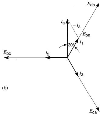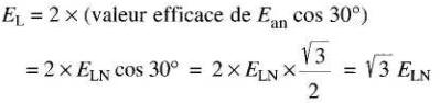 Cette somme vectorielle donne le vecteur Eab montré à la Fig. 26-7c. Il est 30° en avance sur le vecteur Ean et sa valeur efficace EL est donnée par:
