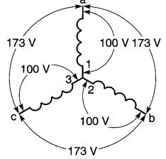 Afin de clarifier davantage ces résultats, nous montrons à la Fig. 26-8 un alternateur dont la tension ligne à neutre est de 100V. Les tensions entre les lignes sont toutes égales et leur valeur est 100 x √3 volts ou 173V.