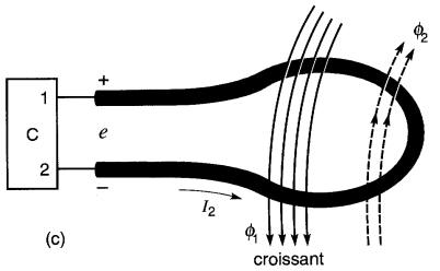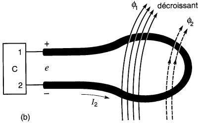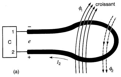 Pour ce faire, on imagine un courant I2 qui circule dans la spire afin de produire un flux o, s'opposant à cette décroissance. Le flux θ2 doit donc être orienté dans le même sens que θ1. En appliquant la règle de la main droite, il s'ensuit que I2 doit circuler dans le sens indiqué. Comme le courant se dirige vers la borne 1, celle-ci est maintenant (+) par rapport à la borne 2.