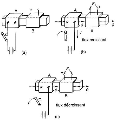 Le flux dans le noyau passe alors de la valeur zéro à une valeur 0; il y a donc variation du nombre de lignes de flux traversant la bobine B.