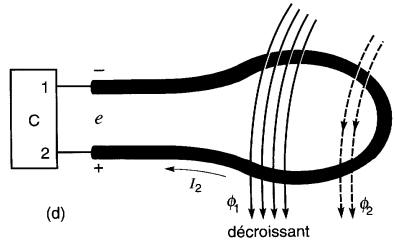 Pour ce faire, on imagine un courant I2 qui circule dans la spire afin de produire un flux θ2 s'opposant à cette décroissance, et créant donc un flux de même sens que θ1. En appliquant la règle de la main droite, il s'ensuit que I2 doit circuler dans le sens indiqué. Comme le courant se dirige vers la borne 2, celle-ci est (+) par rapport à la borne 1.