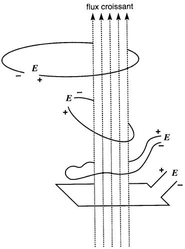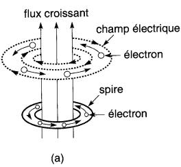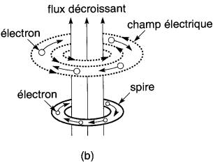 D'après Maxwell, un champ électrique s'établit autour de tout champ magnétique qui varie avec le temps. Les lignes de force de ce champ électrique sont représentées par une série de boucles fermées encerclant les lignes du flux «inducteur» (Fig. 18-8a et 18-8b). Le concept de champ électrique est présenté à la section Phénomènes électrostatiques.