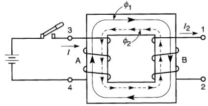 La variation du courant dans une bobine peut induire une tension dans une autre bobine. Soient deux bobines A et B enroulées sur le même noyau d'acier (Fig. 18-5).