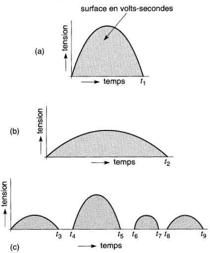 Si l'on mesurait les surfaces hachurées (en volts-secondes) situées en dessous de chacune de ces trois courbes, on constaterait qu'elles sont toutes les mêmes.
