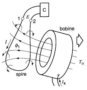 En même temps qu'elle produit son propre champ magnétique, en raison du courant I, la spire est soumise à un champ magnétique extérieur créé par une bobine qui se déplace aléatoirement vers la droite.