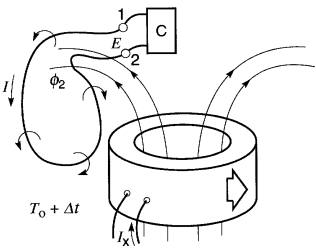 On pourrait difficilement imaginer un montage plus compliqué mais, d'après la loi de Faraday, il suffit de connaître les flux 01 et 02 entourés par la spire au début et à la fin de l'intervalle Δt.