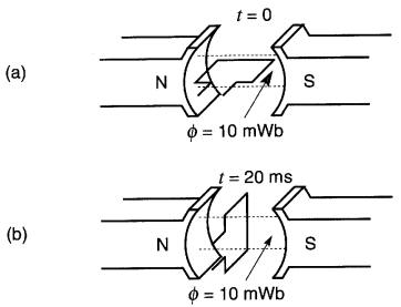 Par exemple, dans la Fig. 18-4a, à l'instant t = 0, le cadre n'est traversé par aucun flux, mais 20 millisecondes plus tard (Fig. 18-4b), après avoir exécuté 1/4 de tour, il est traversé par un flux de 0.01 Wb.