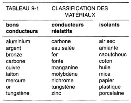 Le tableau 9-1 donne la classification des matériaux les plus utilisés en électrotechnique.