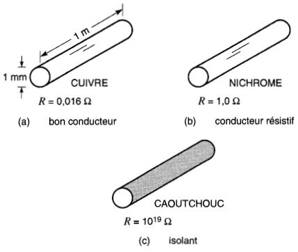 Afin de donner une idée de la résistivité relative des matériaux de chacun de ces groupes, comparons la résistance de trois échantillons ayant 1 millimètre de diamètre et 1 mètre de long (Fig. 9-1).
