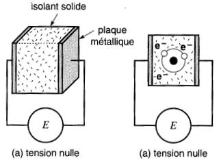 Afin d'expliquer ce phénomène, considérons un isolant solide placé entre deux plaques métalliques, raccordées à une source de tension variable (Fig. 9-4).