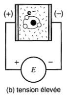 Si l'on continue à augmenter la tension, la force d'attraction devient assez grande pour arracher les électrons de leur orbite autour du noyau (Fig. 9-4c).