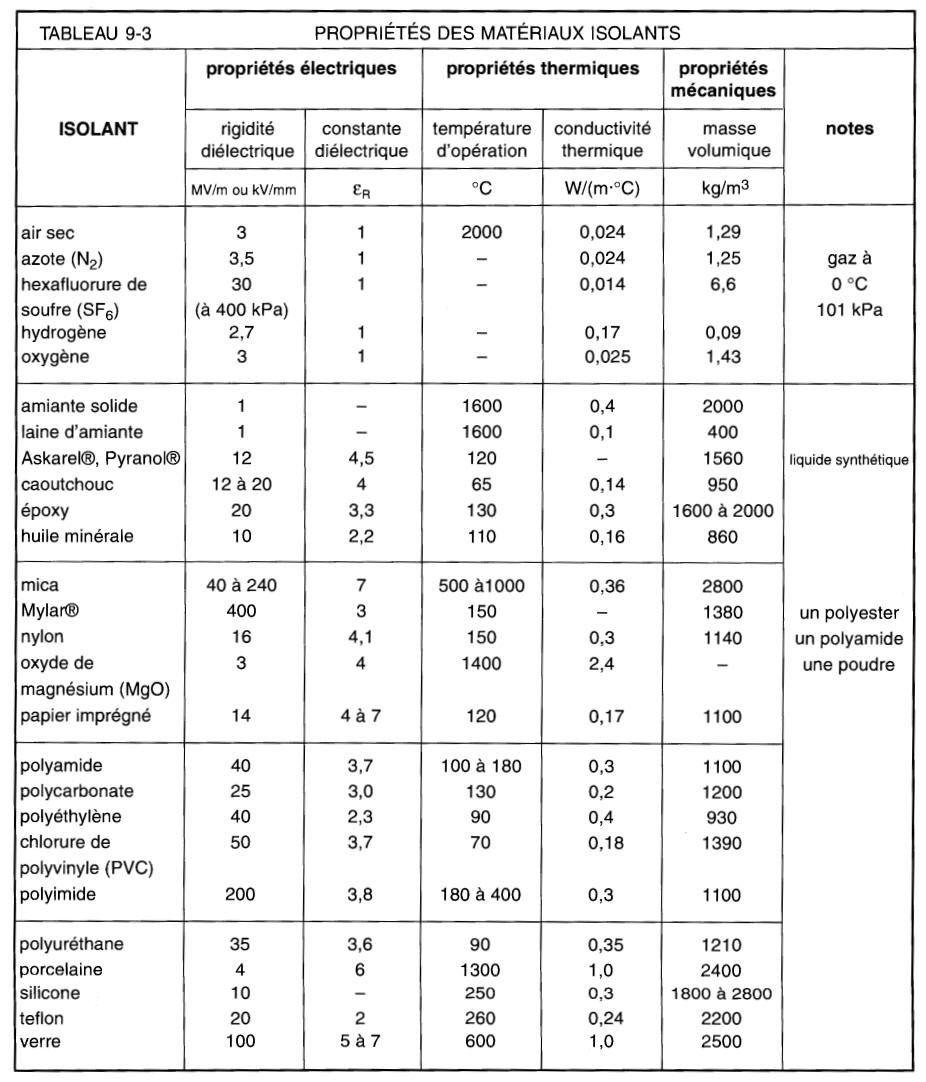 La rigidité diélectrique d'un isolant (en MV/m ou en kV/mm) mesure sa capacité à supporter les tensions élevées sans risquer sa destruction par claquage. Le tableau 9-3 résume les propriétés électriques, thermiques et mécaniques des principaux isolants.