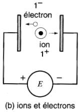 Ces atomes chargés positivement sont appelés ions. Comme les ions positifs sont libres de se déplacer (le matériau est un gaz), ils se dirigent lentement vers la plaque négative alors que les électrons se déplacent vers la plaque positive (Fig. 9-5b).