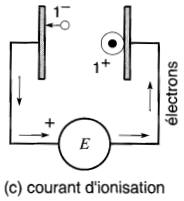 Le circuit formé par la source, les plaques et la région gazeuse est donc traversé par un faible courant appelé courant d'ionisation (Fig. 9-5c).