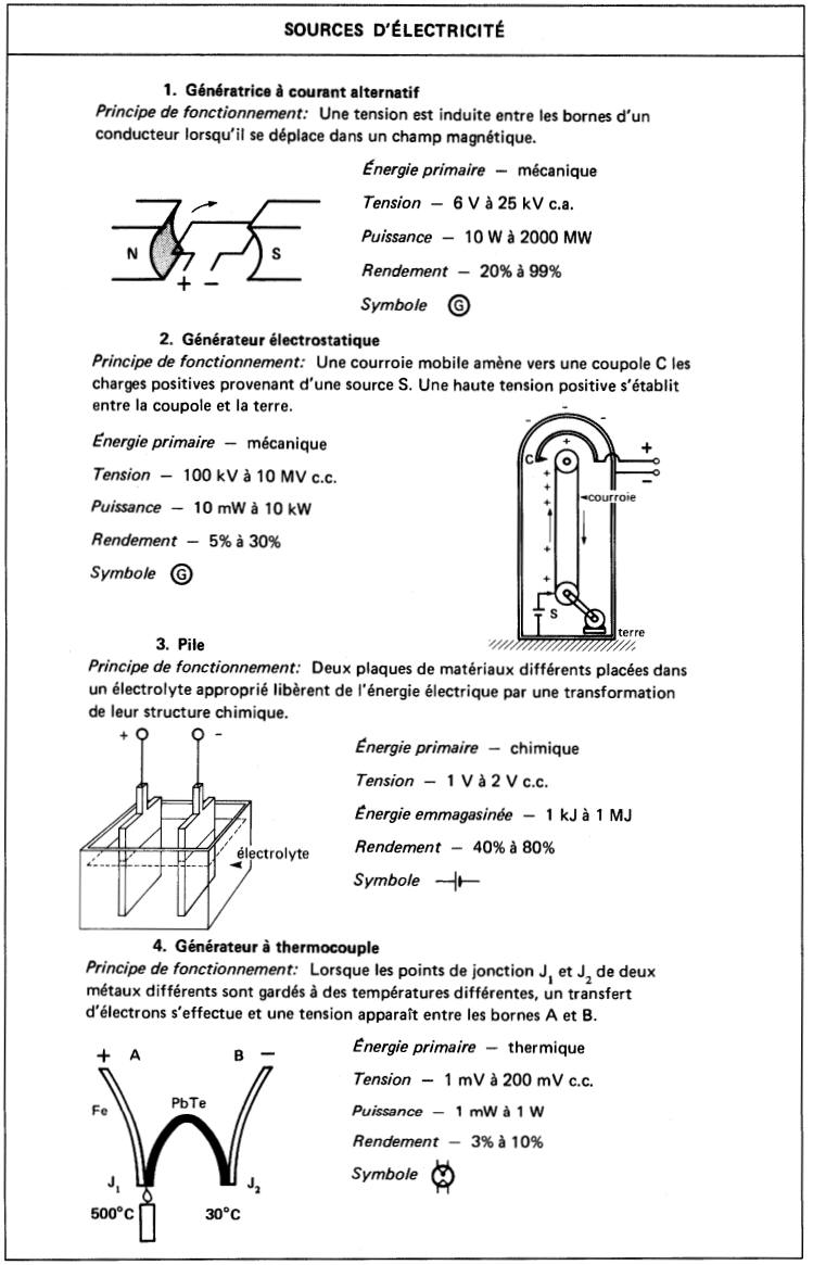Le rôle des sources d'électricité est de transformer l'énergie mécanique, chimique, thermique ou radiante en énergie électrique. Elles réalisent cette transformation en maintenant constamment entre leurs deux bornes une différence dans la population d'électrons.