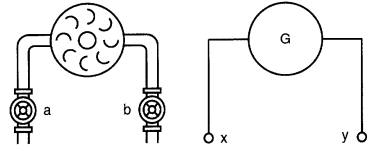 Ainsi, dans la Fig. 3-3, la différence de pression hydraulique entre les points a et b de la pompe peut être comparée à la différence de potentiel électrique entre les bornes x et y du générateur G.