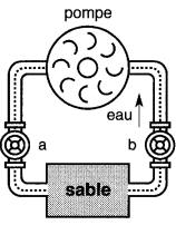 La différence de pression développée par la pompe fait circuler l'eau dans le circuit hydraulique. On peut imaginer que l'eau est composée de milliers de gouttes, qui rencontreront une certaine opposition dans leur passage à travers le sable.