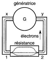 Le frottement entre les électrons et les atomes produit un dégagement de chaleur. Dans la Fig. 3-7 la génératrice (une source) est raccordée à la résistance (une charge) au moyen de deux fils xl et y2.