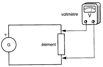 Pour déterminer la différence de potentiel (ou la tension électrique) entre les extrémités de l'élément, on relie les deux bornes d'un voltmètre (V) à ces deux points (voir Fig. 3-10, montage en parallèle ou en dérivation).