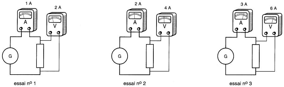 Supposons qu'au moment où la lecture est prise, Fig. 3-11, (essai n° 1), le générateur applique une différence de potentiel de 2 volts et que le courant I résultant soit de 1 ampère.