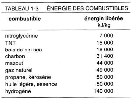 Le tableau 1-3 nous donne une idée de l'énergie thermique libérée par les produits chimiques tandis que le tableau 1-4 établit une comparaison avec les autres sources d'énergie.