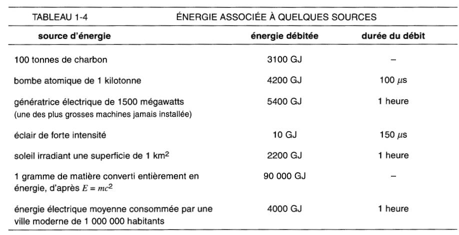 Le tableau 1-4 fait ressortir le fait qu'une grosse génératrice électrique débite en une heure une quantité d'énergie équivalent à celle d'une bombe atomique de 1 kilotonne.
