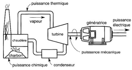 Dans cet exemple, la chaudière, la turbine et la génératrice sont les machines qui effectuent la transformation d'énergie.