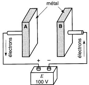 La méthode la plus simple pour transférer des électrons d'un corps à un autre consiste à relier deux plaques métalliques à une batterie de piles (Fig. 20-6a).