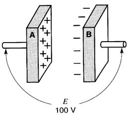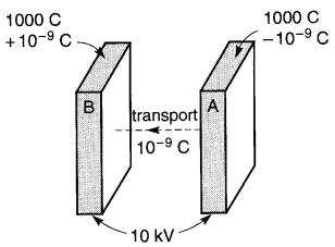 Figure 20-2b Si l'on transporte seulement 10-9 coulombs de la plaque A à la plaque B, il en résulte un d.d.p. de 10 kV