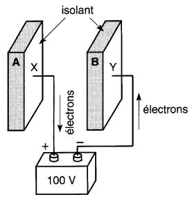 L'isolant qui les sépare peut être de l'air, un isolant liquide ou solide, ou le vide. Admettons que, par un moyen quelconque, on soit capable d'enlever des électrons libres du corps A et de les déposer sur le corps B.