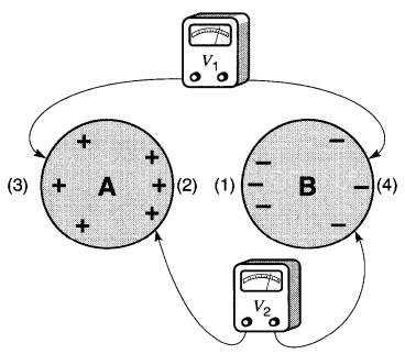 La charge positive sur A et la charge négative sur B ne sont donc pas réparties de façon uniforme. Cependant, la différence de potentiel entre deux points quelconques de la même sphère est rigoureusement nulle.