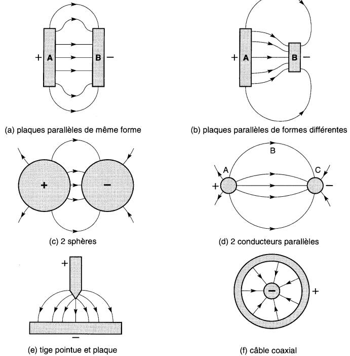 De la même façon qu'un conducteur parcouru par un courant est entouré d'un champ magnétique, deux corps chargés d'électricité de signes contraires créent un champ électrique. Le spectre de ce champ électrique est composé de lignes de force partant des charges positives (+) et aboutissant sur des charges négatives (-).